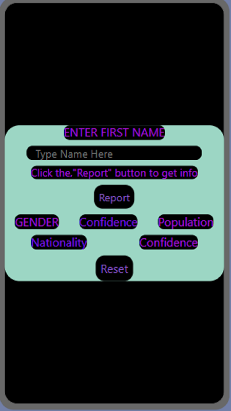 جب آپ ایپ کھولیں گے اور "جاری رکھیں" کو دبائیں گے تو وہاں موجود ہوگا۔ ایک سیاہ، سفید اور جامنی رنگ کی سکرین۔ آپ کسی بھی نام میں ٹائپ کر سکتے ہیں مثال کے طور پر، "زیادہ سے زیادہ،" وہ نام ریاستہائے متحدہ کے مرد کے طور پر درج کیا جائے گا۔ آپ کر سکتے ہیں۔ بہت سے نام کرو! جب آپ کوئی دوسرا نام کرنا چاہتے ہیں تو صرف ری سیٹ کو دبائیں اور بہت سے دوسرے ناموں کے ساتھ بالکل وہی عمل کریں!
