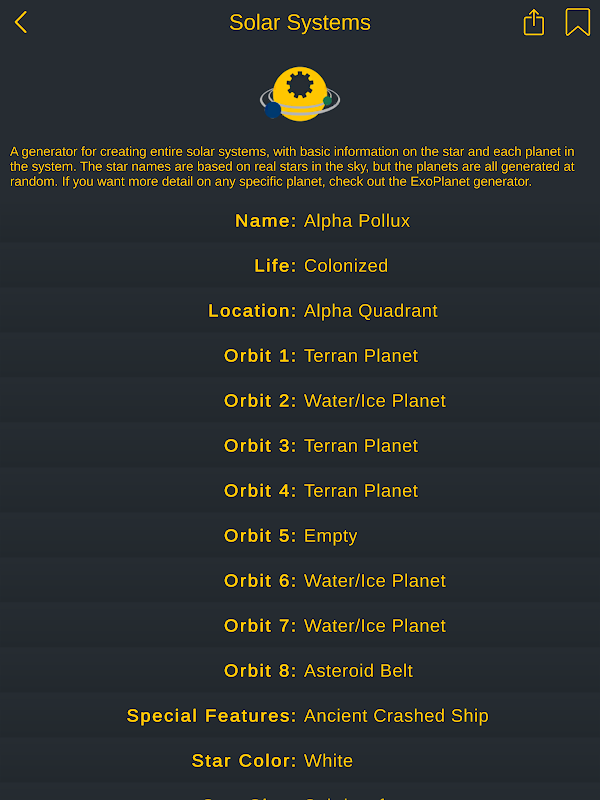 - ہر کردار، مخلوق، یا جگہ مکمل طور پر تفصیل سے آتی ہے - نام، ماحول، زندگی کی اقسام، نظام شمسی کی تفصیلات، اور بہت کچھ جانے کے لیے تیار ہے۔ پیدائش ہر وہ چیز بناتی ہے جس کی آپ کو اپنی کہانی سنانے کی ضرورت ہوتی ہے۔