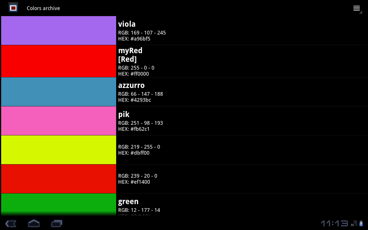 In the Settings menu you can also: access to your archive of colors, backup and restore it, choose the theme of the application (just for smartphone, not for tablet), choose to not display notifications and hints, choose to not display the Status Bar (increasing the visual space, just for smartphone), hide the navigation arrows, show or hide the Color Picker, show or hide HTML colors, manually enter HTML colors via name or via HEX value, manually enter the RGB values, show 2 additional buttons that allow you to adjust the generation rate of the colors, reset the original value of this speed, turn off the Haptic Feedback (not for Motorola Xoom).