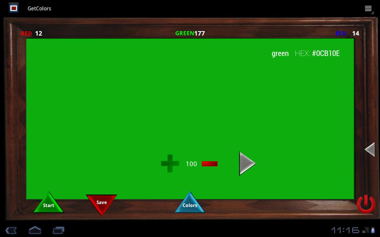 with the START and STOP buttons you start or stop the sequence of colors randomly generated; at the top of the screen will display the corresponding RGB and HEX values. When the sequence is stopped, the STOP button functionality changes and becomes SAVE, pressing it you can save the current color on the screen in your personal database of colors and then access it via Settings menu or via COLORS button. To move in the sequence of colors that are already created, you can use left and right arrows.