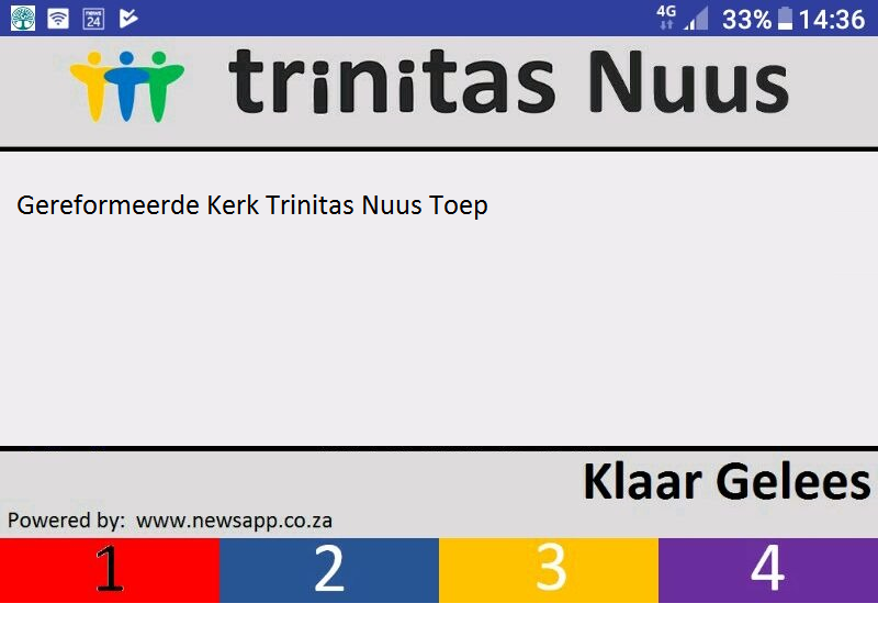 Lees nuus vanaf die Gereformeerde Kerk Trinitas in Vanderbijlpark op jou slimfoon. Alle nuus maklik op een plek waar dit gemaklik gelees kan word. Slegs beskikbaar vir Android selfone op die oomblik.
