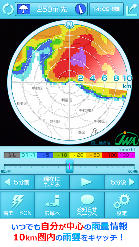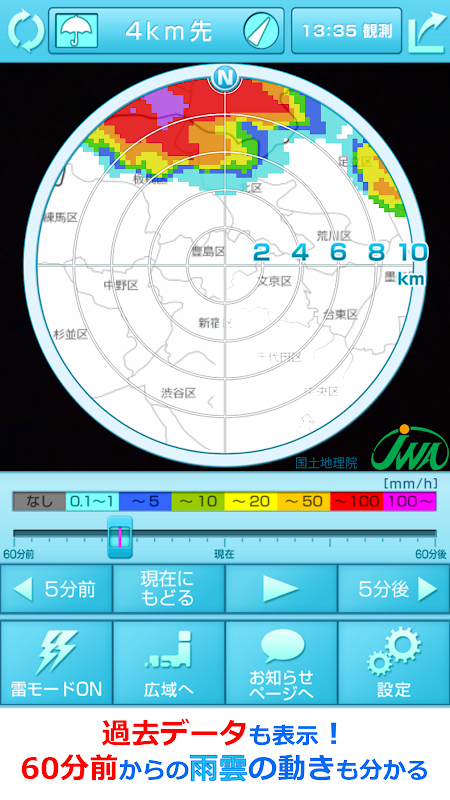 real اصل وقت میں موجودہ مقام کے گرد 5 کلومیٹر یا 10 کلومیٹر * بارش کی معلومات دکھاتا ہے۔
