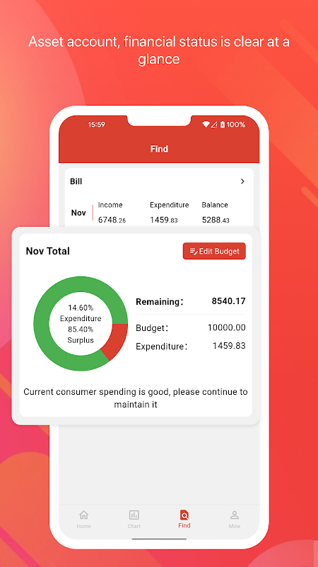 درج کردہ ڈیٹا کی بنیاد پر، آپ اپنے اخراجات کو زمرہ کے لحاظ سے اور ہر مہینے کے درمیان تبدیلیوں کو فوری طور پر دیکھ سکتے ہیں۔ اور آپ اپنی آمدنی/خرچ کی تبدیلی کو بھی دیکھ سکتے ہیں جس کی نشاندہی گراف سے ہوتی ہے۔