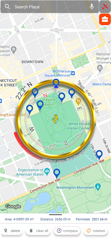 آپ اس ورچوئل کمپاس کو دنیا کے تمام مقامات پر لگا سکتے ہیں اور نقشے کو تلاش کر سکتے ہیں۔ یہ ایپ تلاش کی گئی جگہوں کے فاصلے، زمینی رقبے کی پیمائش کا فنکشن بھی فراہم کرتی ہے اور اس میں ببل لیول میٹر کی خصوصیت بھی شامل ہے۔