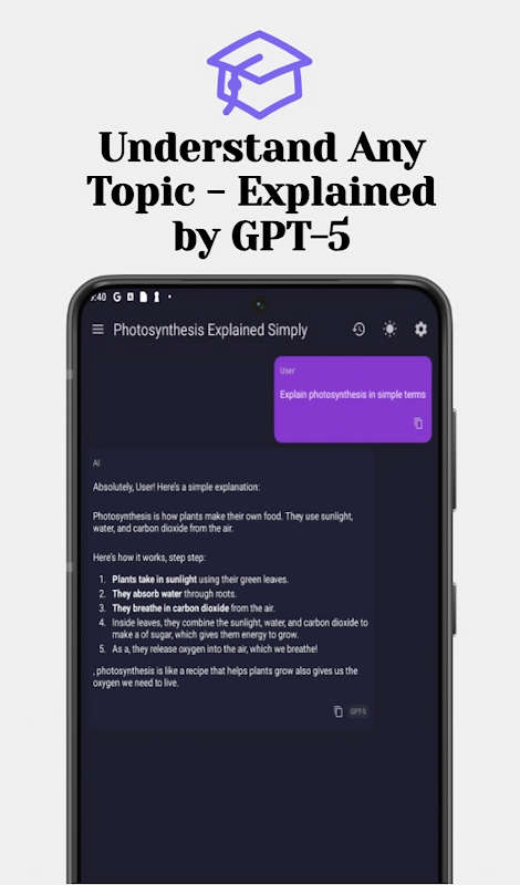 آج دستیاب جدید ترین AI اسسٹنٹ کے ساتھ چیٹ کریں، لکھیں، ترجمہ کریں، کوڈ کریں اور سیکھیں۔ جدید ترین GPT-5 ماڈل کے ذریعے تقویت یافتہ، یہ ایپ فوری، درست اور قدرتی ردعمل فراہم کرتی ہے — کسی بھی وقت، کہیں بھی 🌍۔