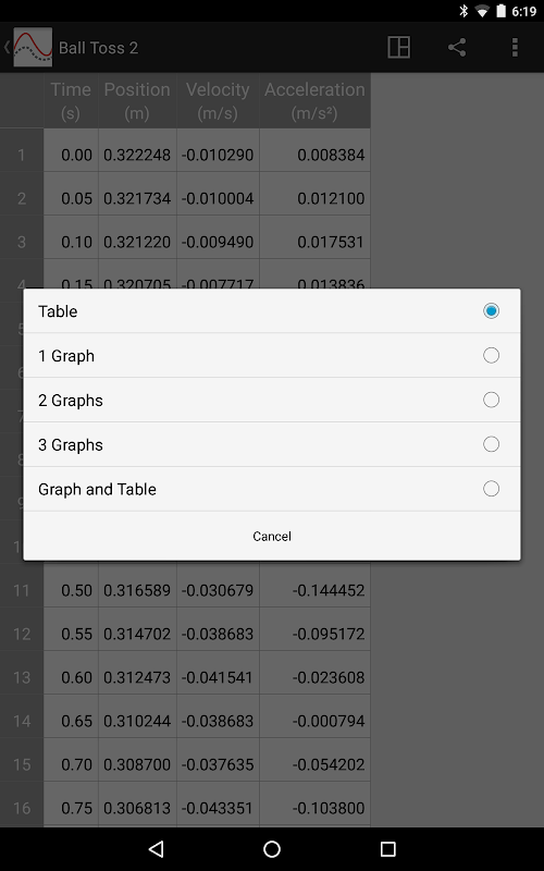 Note: The above features apply to version 3.2 only, available for devices running Android OS version 4.3 or newer. Android devices running OS versions 4.1-4.22 will receive Graphical Analysis version 1.2, which only supports Data Sharing, Built-in Sensors, and Manual Entry experiments.