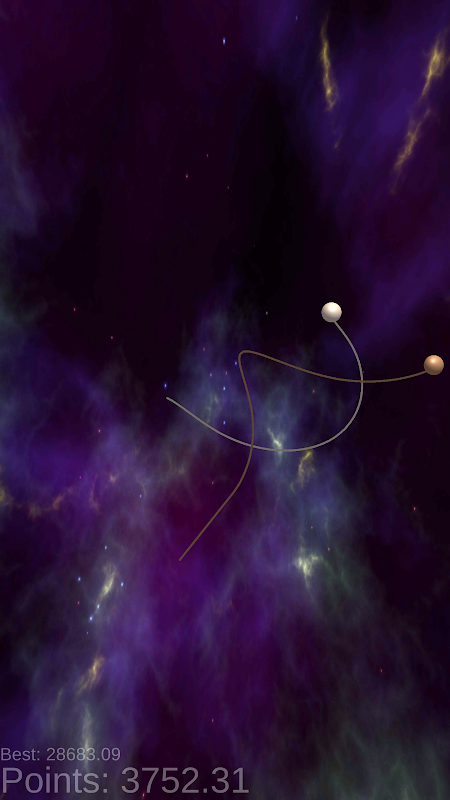 Draw your finger across the screen to define the first direction and speed of one bubble. Do this again for the second bubble. Now both bubbles will contract each other like planets and stars. Your goal is to let them rotate around each other as long as possible. You get points over time and more the less the distance between both bubbles is. Try to reach your best points!