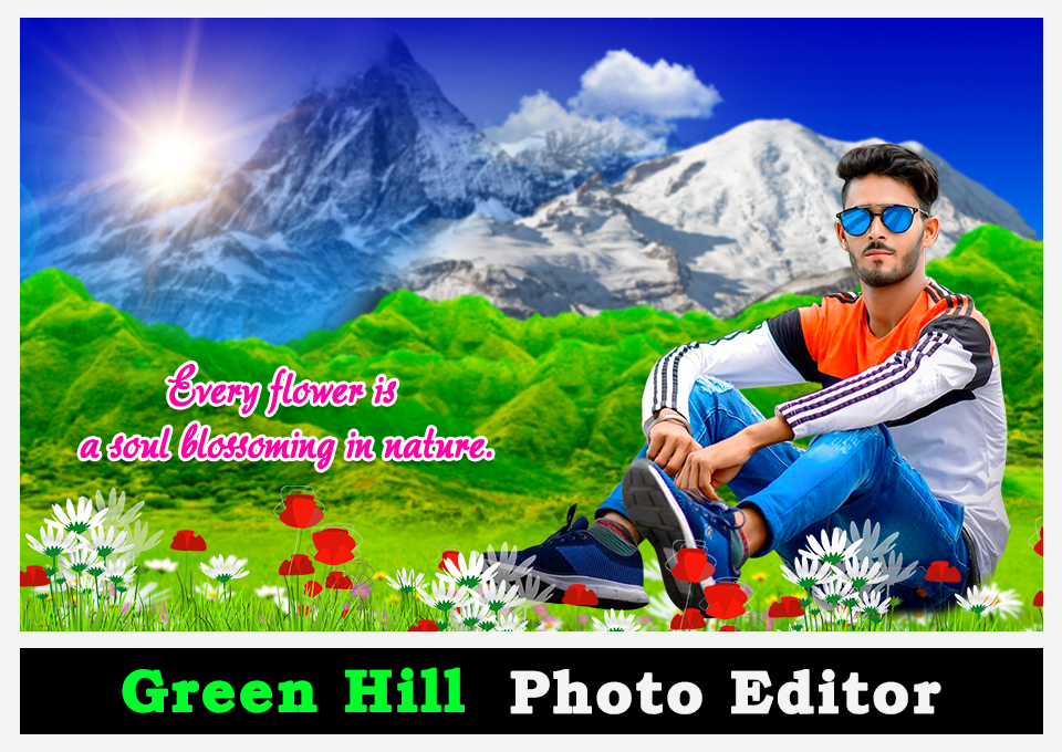 گرین ہل فوٹو ایڈیٹر جس میں خوبصورت پہاڑی کا پس منظر اور اسٹیکر ہے