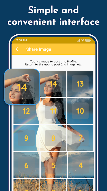 فوٹو گیلری سے ایک نئی تصویر منتخب کریں۔ پانچ دستیاب اختیارات میں سے ایک مناسب سائزنگ آپشن کا انتخاب کریں، اور Grid Maker فوٹو اسپلٹ کو آپ کے لیے تصویر کو تراشنے دیں! اس کے بعد، آپ کو نتیجے میں آنے والی تصویروں کو اپنے پروفائل میں اس ترتیب میں جمع کرنا ہوگا جس ترتیب سے ایپ تجویز کرتی ہے۔ آپ کو اپنے آلے میں ٹائلز کو محفوظ کرنے کی ضرورت نہیں ہے کیونکہ 15 اسکوائر گرڈ میکر کو شیئر کرنا ایپلی کیشن میں سرایت کر گیا ہے!
