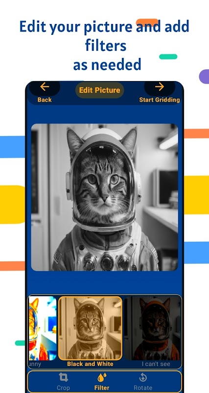 Gridify آپ کو اپنی تصویروں میں ترمیم کرنے دیتا ہے جیسا کہ آپ مناسب دیکھتے ہیں۔ فلٹرز سے لے کر تصاویر کا سائز تبدیل کرنے کے اختیارات کے ساتھ۔