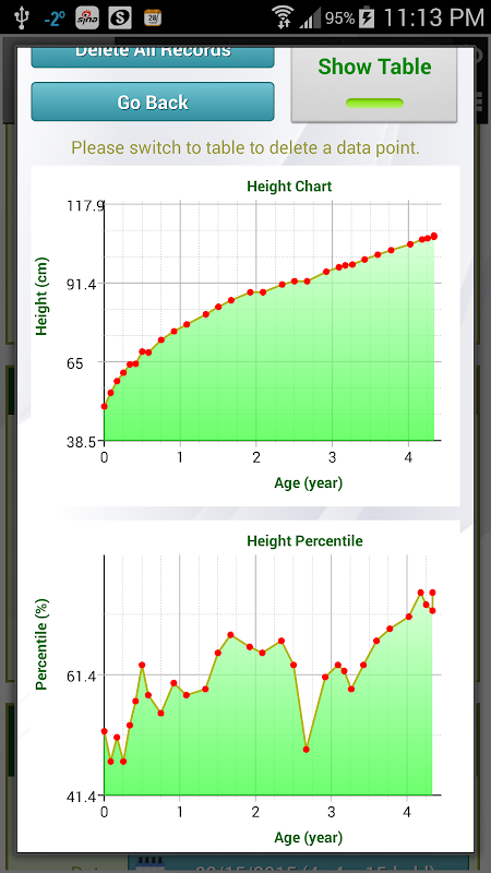 You can add multiple children and save all your data to the database for future review. The saved data can be viewed as tables, or as graphs (values/percentiles vs. ages). It provides you with the median value of weight/height/head CC at your children’s age, and you can get the values at any percentile by easily sliding the percentage bar. So you can compare your children’s growth with that of others, and log your children’s growth history and learn the trend.