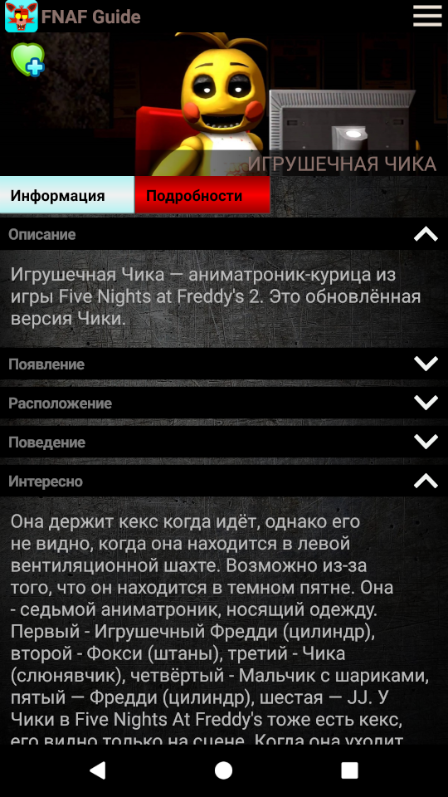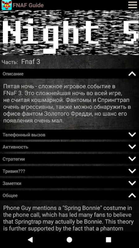 Guide for FNAF - created especially for the fans of the game Five Nights at Freddy's Fangames. Our application contains only relevant information, and is constantly updated. Guide for FNAF includes lots of information that was collected by the same fans just like you. Here you can find different articles about the monsters, nights, and more. No other application offers a number of precise descriptions, tips and useful features.