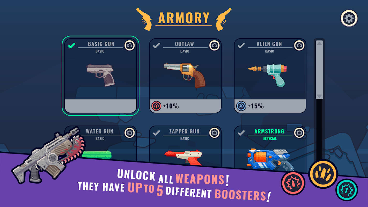 Choose the right direction, start shooting and spend your hard-earned coins on power-ups that can upgrade your weapons and their stats.