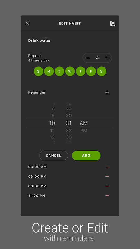 Create an individual reminder for each habit, at a chosen hour of the day.