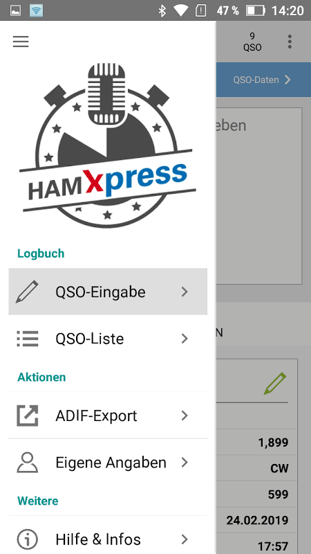 HAM Xpress الیکٹرانک QSO اندراج کے لئے ایک مفت مفت اندراج کا پروگرام ہے۔ ایک بار جب آپ خود سے اس سے واقف ہوجائیں تو ، ہم ہیم آفس .میری لاگ بک کو استعمال کرنے کی تجویز کرتے ہیں۔ پی سی پر آپ HAM Xpress میں لامحدود QSOs داخل کرسکتے ہیں ، جس کے تحت آپ اکثر 300 QSOs سے ہماری سفارش دیکھیں گے۔ اسمارٹ فون یا ٹیبلٹ پر QSOs کی تعداد 200 QSOs تک محدود ہے۔ آپ کسی بھی وقت پروگرام میں ہام آفس ماسٹر ایڈیشن کے پریمیم لائسنس کے لئے رجسٹریشن نمبر درج کر سکتے ہیں۔ پھر پروگرام کسی بھی ڈیوائس پر اور بغیر کسی سفارش کی تصاویر کے غیر یقینی طور پر چلتا ہے۔