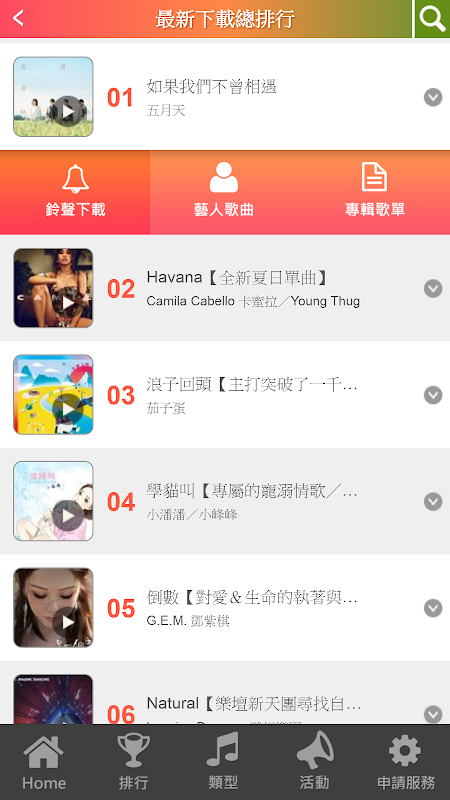 提供最新最便利的鈴聲,換音樂隨著自己的心情變化 ,週週更新內容,讓你可搶先擁有熱騰騰的Top排行榜,涵蓋中文、西洋、日韩剧、Hip Hop嘻哈、老歌、爵士、等十幾種熱門曲風