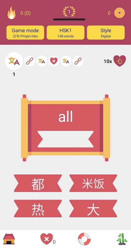 - منفرد گیم پلے: ہینزی، پنین، اور انگریزی الفاظ کو 4 اختیارات کے ساتھ میچ کریں۔