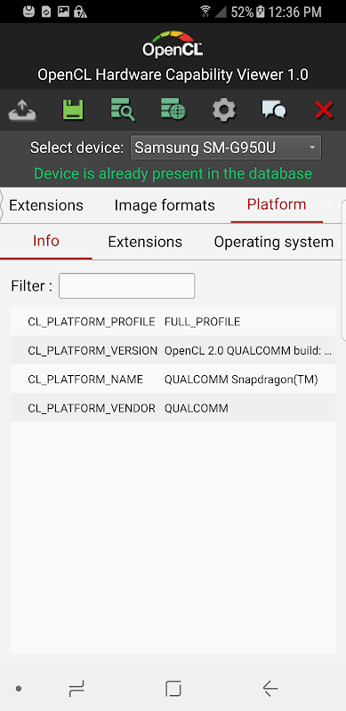 اس ٹول کے ذریعے تیار کردہ رپورٹس کو پھر عوامی ڈیٹا بیس (https://opencl.gpuinfo.org/) پر اپ لوڈ کیا جا سکتا ہے جہاں ان کا مختلف پلیٹ فارمز پر موجود دیگر آلات سے موازنہ کیا جا سکتا ہے۔ ڈیٹا بیس عالمی فہرستیں بھی پیش کرتا ہے جیسے چیک کریں کہ فیچرز اور ایکسٹینشنز کو کس حد تک سپورٹ کیا جاتا ہے۔