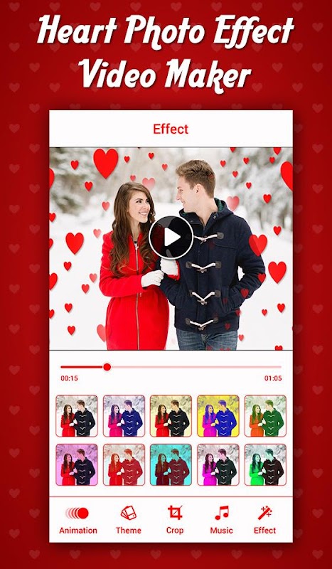 Easy to create attractive, lovely video with heart effect, love effect, rain effect, snow effect, firework effect and music.
