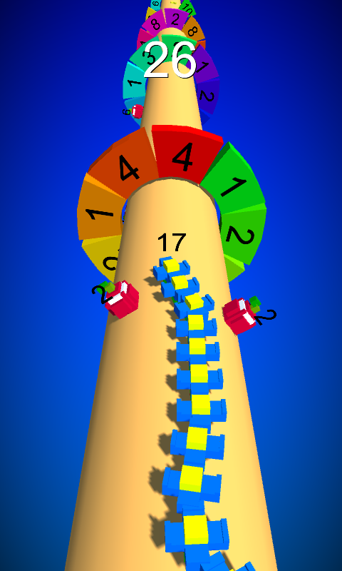玩家滑动屏幕滚动贪吃蛇,将柱子上的螺旋砖块打破就可以获得相应的分数。
