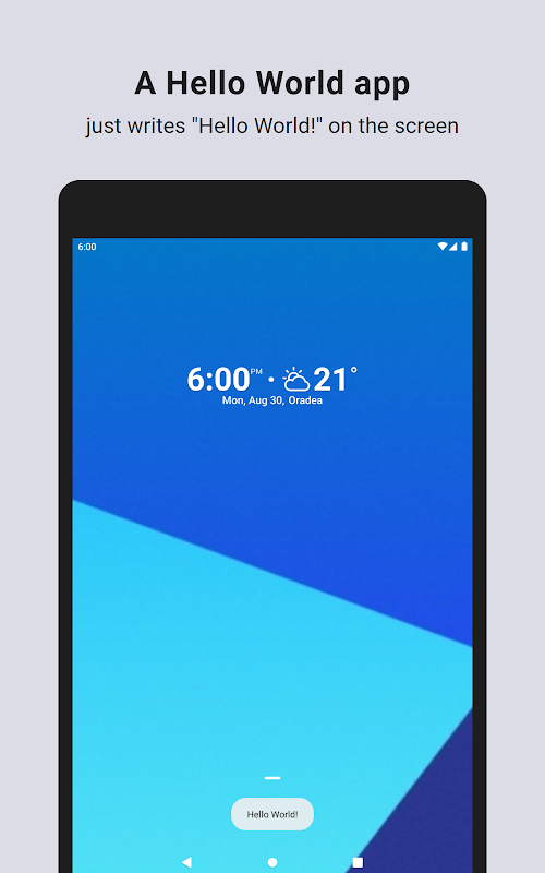 ہیلو ورلڈ ٹوسٹ ایک معیاری اینڈرائیڈ ایپ ہے ، جسے کسی بھی اینڈرائیڈ ڈیوائس پر انسٹال کیا جا سکتا ہے ، اور ایپس یا ہوم اسکرین سے شروع کیا جا سکتا ہے۔ یہ سب کچھ کرتا ہے مشہور "ہیلو ورلڈ!" ٹوسٹ میں ٹیکسٹ - اینڈرائیڈ کا چھوٹا پاپ اپ جو صارف کو فوری پیغامات دکھانے کے لیے استعمال ہوتا ہے۔ پھر ایپ شروع ہونے سے پہلے ہی بند ہو جاتی ہے۔ یہی ہے!