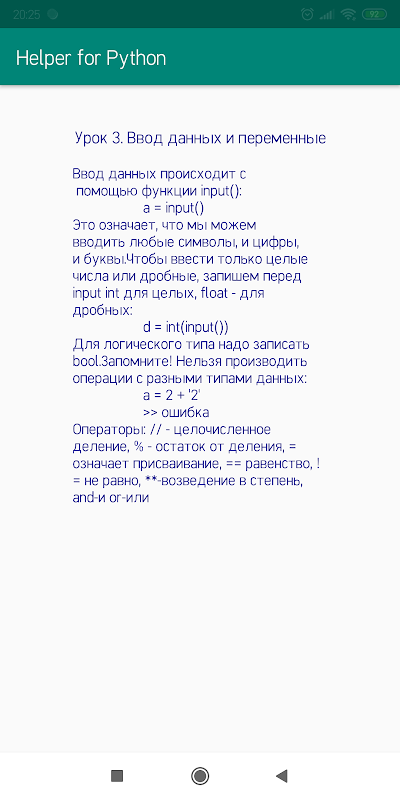 Приложение Helper for Python - это программа по обучению такого языка программирования, как Python, одного из самых востребованных и современных. Изучите теорию, определения, пройдите тесты к каждому уроку и узнайте свой уровень знаний Python. Пользуйтесь советами и учитесь писать программы. Успехов в обучении!