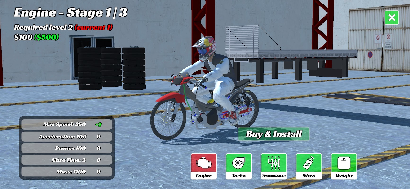اس گیم میں، کھلاڑیوں کو ٹھنڈی ڈریگ ریس میں ترمیم کے تصورات کے ساتھ کئی موٹر بائیکس کا انتخاب کرنے کی اجازت ہے جو فراہم کیے گئے ہیں۔ کھلاڑی اپنی موٹر سائیکل کی کارکردگی کو بہتر بنانے کے لیے اپ گریڈ بھی کر سکتے ہیں۔
