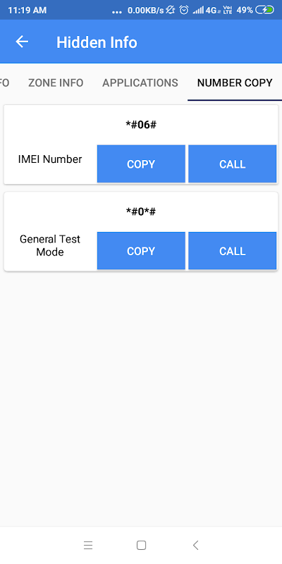 اینڈرائیڈ کی پوشیدہ سیٹنگز فون کی معلومات کی خصوصیات میں یو ایس ایس ڈی کوڈز (غیر ساختہ سپلیمنٹری سروس ڈیٹا) ڈیوائسز کے IMEI کوڈز تلاش کرنے اور بہت سے دوسرے ٹیسٹنگ مقاصد کے لیے ایک علیحدہ ٹیب ہے۔