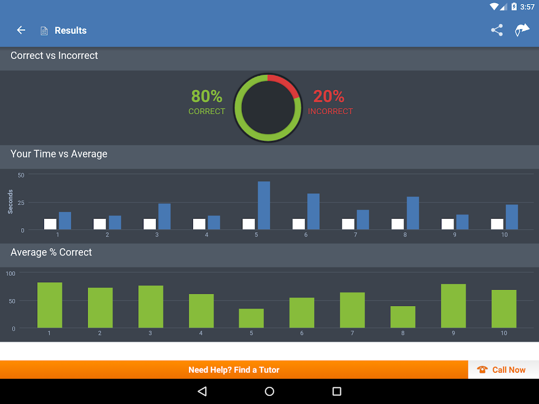 طلباء ایپ کے ٹیسٹ ٹیکن فیچر میں اپنی بہتری کو بھی ٹریک اور شیئر کر سکتے ہیں، جو صارف کو آسانی سے اساتذہ اور ٹیوٹرز کو ٹیسٹ سکور بھیجنے کی اجازت دیتا ہے۔ یہ فیچر طالب علم کی کارکردگی کا جائزہ بھی پیش کرتا ہے، تصوراتی علاقے کے لحاظ سے تقسیم کیا گیا ہے جن سوالات کے صارف نے کامیابی کے ساتھ جواب دیا اور جن کو بہتر بنایا جا سکتا ہے۔