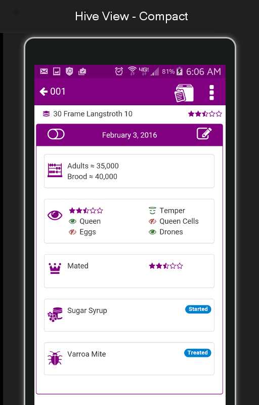 With HiveTool Mobile's Express Setup feature you'll build up your apiary's (bee yard) beehives in seconds, not minutes or hours. Simply create an apiary, specify how many beehives there are and stage beehive configurations in short order. You'll be logging inspections in no time.