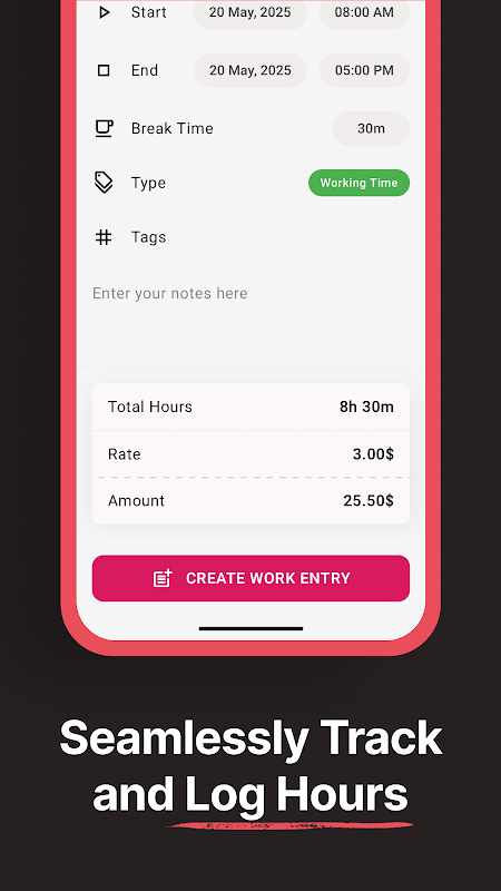 انٹرفیس رفتار اور سادگی کے لیے ڈیزائن کیا گیا ہے۔ ڈارک یا لائٹ موڈ استعمال کریں، حسب ضرورت یاد دہانیاں سیٹ کریں، اور ہموار خصوصیات کے ساتھ توجہ مرکوز رکھیں۔ یہ کام کے اوقات کے ٹریکر سے زیادہ ہے - یہ ایک مکمل ٹائم کیپنگ اور ورک لاگ ٹریکر ہے۔