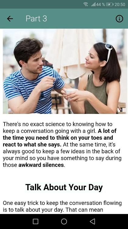 ہماری ریلیشن شپ کوچنگ ایپ، جو شرمیلی اور ناتجربہ کار لوگوں کے لیے بنائی گئی ہے، یہ بتاتی ہے کہ خواتین سے بات کیسے کی جائے، خواتین کے ساتھ قدرتی طور پر بات چیت کی جائے، بات چیت کو کیسے شروع کیا جائے، اور لڑکیوں کی توجہ مبذول کرنے کے لیے قدم بہ قدم چھیڑ چھاڑ کی تجاویز کے ساتھ پہلی ملاقات میں کیا کہنا ہے۔