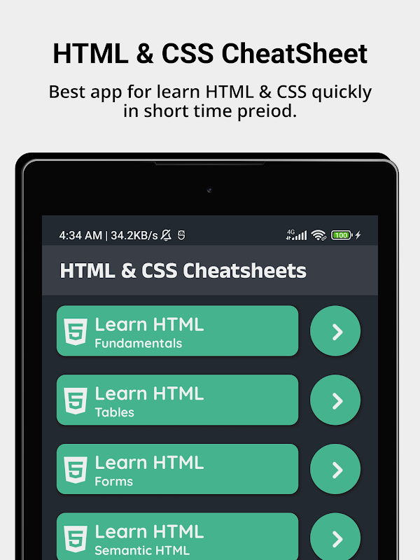 Cheatsheet کا استعمال کرتے ہوئے HTML اور CSS کوڈ سیکھیں مختصر وقت میں کوڈ سیکھنے کا آسان طریقہ ہے۔ اس ایپ میں، ہر عنوان کی اپنی مثالیں ہیں۔