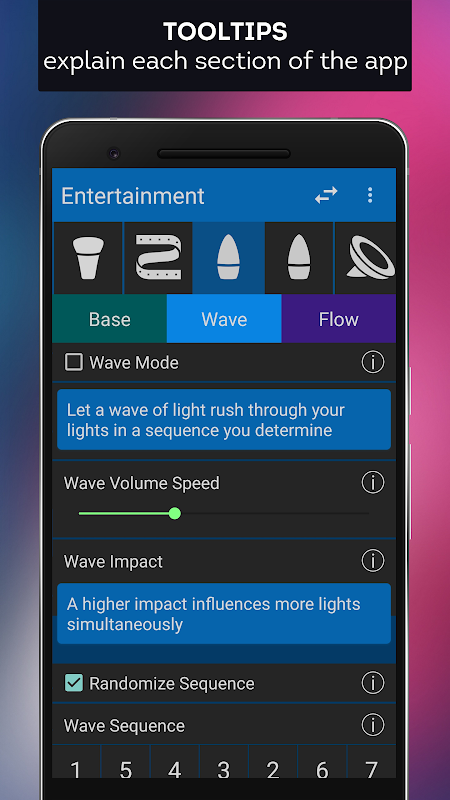 ★ Wave Mode lets an impulse of light rush through your system. You can change the speed, impact (number of affected light) and wave form