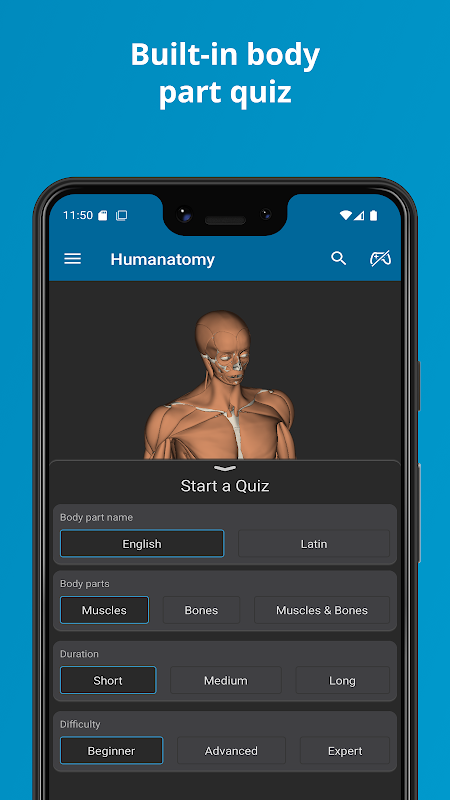 بلٹ میں باڈی پارٹ کوئز کا استعمال کرکے سیکھنے کو تفریح بنائیں۔ چاہے ہڈیاں ، عضلات یا دونوں ، آپ جو کچھ سیکھنا ہے اسے منتخب کرنے کے لئے آزاد ہیں۔