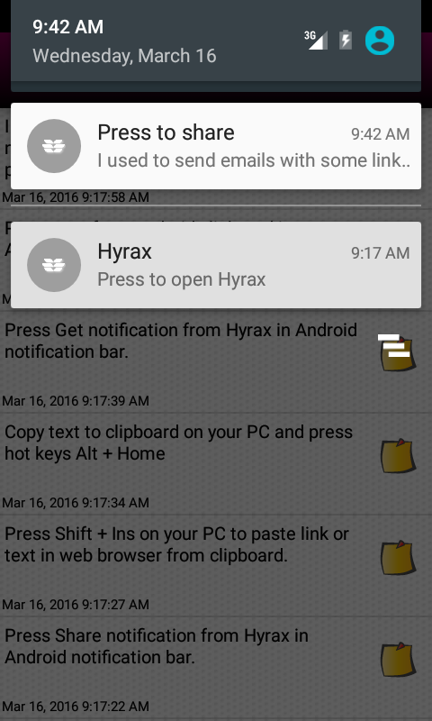 Never miss your Android notifications and get them on computer. Hyrax delivers notifications from Android apps such as Facebook, Skype, Twitter, Instagram, LinkedIn and other messengers and social networks directly to your computer.