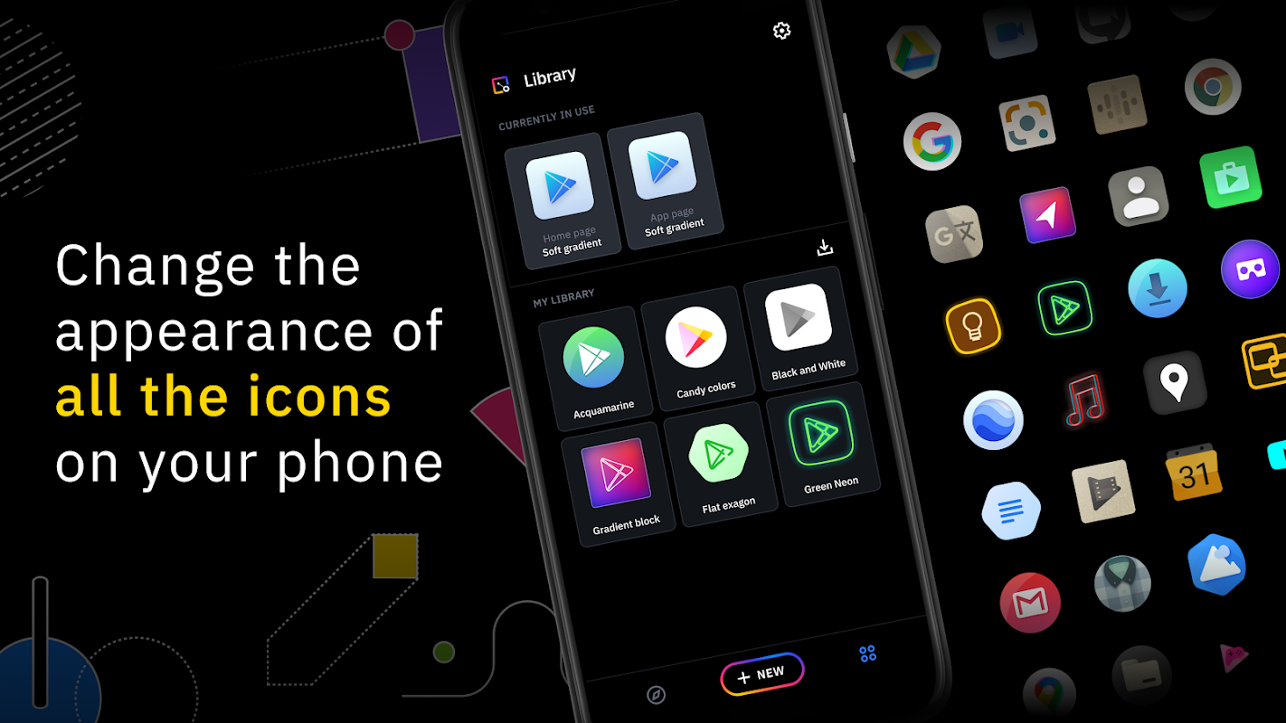 جدید ترین ایڈیٹر آپ کو اپنی مرضی کے آئکن کے کسی بھی عنصر کا سائز تبدیل کرنے اور منتقل کرنے کی اجازت دیتا ہے۔ لائٹس ، سائے ، ٹیکسٹچر ، اور بیزلز جیسے خصوصی فلٹرز کا استعمال کریں اور جب آپ نتیجہ سے خوش ہوں تو ، اپنے آئیکن پیک کو اپنی مرضی کے لانچر پر صرف کچھ نلکوں پر لگائیں۔
