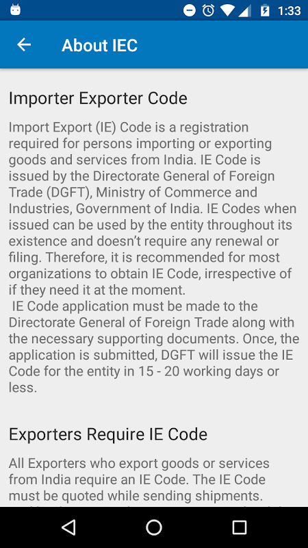 Disclaimer: This app is NOT an official app for IEC. Neither this app or AppYogi Software are related to DGFT or any government agency. The information provided here is provided based on best effort basis and AppYogi Software does not guarantee or verify the authenticity of the same. AppYogi Software or its affiliates will not be responsible for any harm, loss or damage arising out of using information provided on this application. By using this app you agree to the Terms and Conditions and Privacy policy of the company.