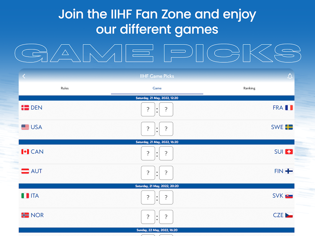 ابھی ڈاؤن لوڈ کریں اور آفیشل IIHF ایپ کے ساتھ بین الاقوامی آئس ہاکی کی دنیا کو فالو کریں۔