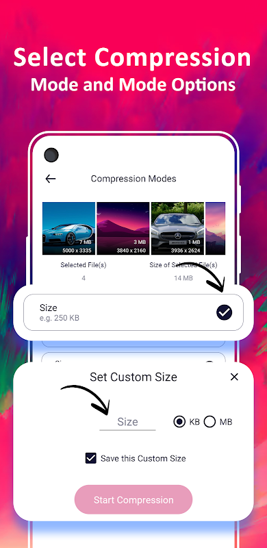 اپنے مطلوبہ کمپریشن موڈز کو منتخب کریں یعنی پیمانہ نیچے، سائز، ریزولوشن یا کوالٹی