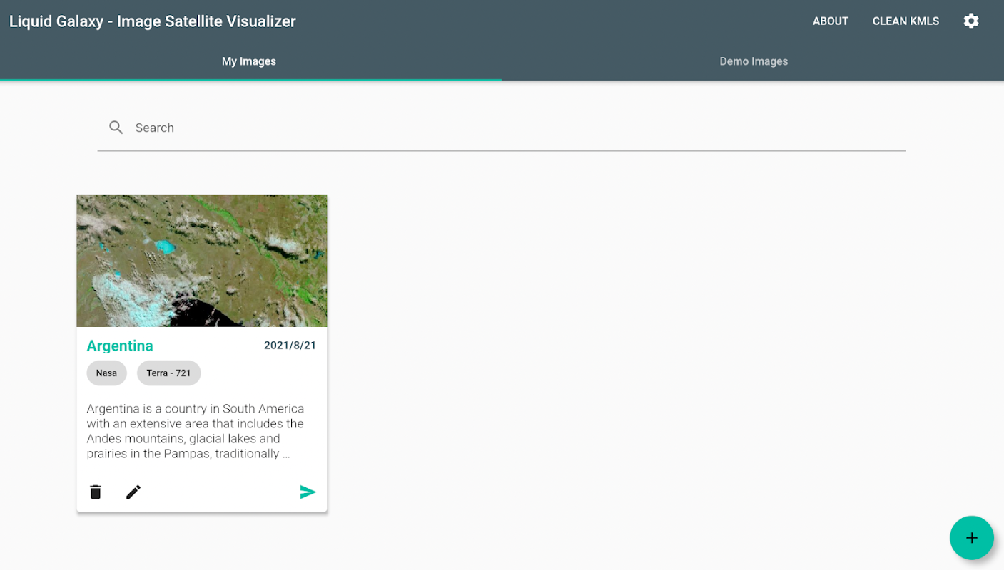 مائع کہکشاں بطور ایک بامعنی پریزنٹیشن ٹول میں بہت سی معلومات ہیں جو مختلف مقاصد جیسے تعلیمی آلے ، یا مانیٹرنگ سسٹم کے لیے دکھائی جا سکتی ہیں۔ اس بات کو ذہن میں رکھتے ہوئے ، اس منصوبے کا خیال سیٹلائٹ امیجز کا اصل وقت کا تصور ہے جو کہ گوگل ارتھ کی تہوں کے طور پر منسلک ہوں گے ، اس کے علاوہ زمین کی مختلف معلومات کو گرافک طور پر طوفان ، آگ ، بڑے پیمانے پر پیدا کرنے کے قابل ہونا گرمی اور پانی کا بخارات ، ایک ہم آہنگ زمین کا منظر زیادہ پیچیدہ تعامل کی اجازت دے گا۔ وہاں سے ، پوری ایپلی کیشن کو ایک اسکرپٹ کے ذریعے کنٹرول کیا جائے گا جو سیٹلائٹ کے بیرونی APIs (جیسے NASA API اور Copernicus) کو کی جانے والی کالوں کے انتظام کے لیے ذمہ دار ہے جو کہ kml بنانے کے لیے ضروری میٹا ڈیٹا کے ساتھ جواب دیتا ہے اور ایک ٹیبلٹ ایپلی کیشن جو صارف کو کنٹرول دے گی۔ کون سی تہوں یا معلومات کو ظاہر کرنا چاہتے ہیں اور API کالوں کو سنبھالنے ، KMLs کو ہیرا پھیری کرنے اور باش سکرپٹ کے ذریعے مائع کہکشاں کو بھیجنے کے لیے ذمہ دار ہیں۔ ایپلیکیشن کا فرنٹ اینڈ فلٹر کے ساتھ تیار کیا جائے گا اور صارف کی منتخب کردہ تصویر منتخب کردہ آپشنز کی بنیاد پر تیار کی جائے گی۔