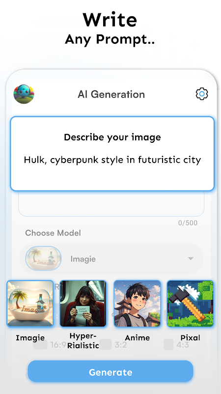 AI کی طاقت کا استعمال کرتے ہوئے الفاظ کو تصاویر اور خوبصورت ڈیجیٹل آرٹ ورکس میں تبدیل کریں! آپ کو صرف ایک پرامپٹ درج کرنے کی ضرورت ہے، ایک آرٹ اسٹائل منتخب کریں - اور دیکھیں ImagieAI - AI آرٹ جنریٹر آپ کے خیال کو سیکنڈوں میں زندہ کرتا ہے۔ AI چیٹ ایک انقلابی ImagieAI ہے جو ChatGPT اور GPT-4، GPT-3 کے ذریعے تقویت یافتہ ہے۔