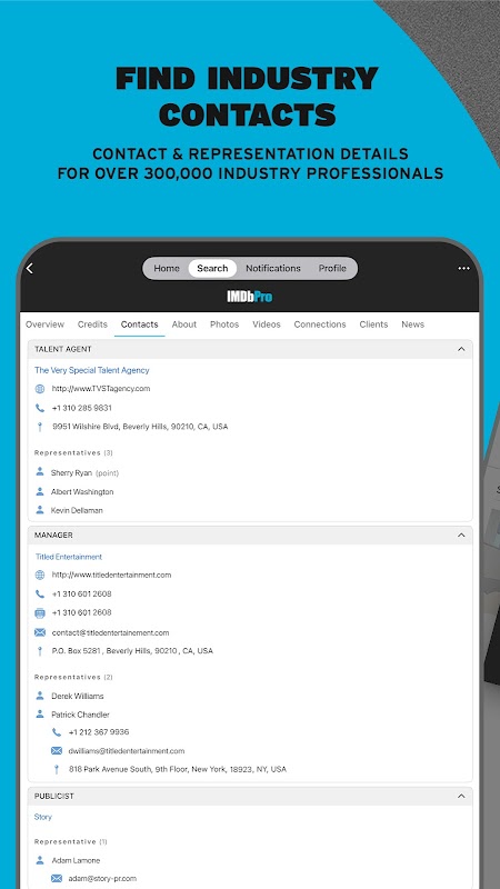 تفریحی صنعت کے پیشہ ور افراد کے لیے ضروری، IMDbPro تفریحی رابطوں اور منصوبوں کے سب سے جامع ڈیٹا بیس تک بے مثال رسائی فراہم کرتا ہے۔ اداکار، فلم ساز، ایجنٹ، مینیجرز، اور کاسٹنگ ڈائریکٹرز اپنے پیشہ ورانہ پروفائلز کا نظم کر سکتے ہیں، نمائندگی تلاش کر سکتے ہیں، اور ممکنہ آجروں کے سامنے کھڑے ہو سکتے ہیں۔ اداکاروں، ہدایت کاروں، مصنفین، پروڈیوسروں، اور عملے کے ارکان کے تفصیلی پروفائلز کے ساتھ، آپ آسانی سے فلم اور ٹی وی پراجیکٹس کو پروڈکشن کے ذریعے ترقی سے ٹریک کر سکتے ہیں اور انڈسٹری کی چالوں پر اپ ڈیٹ رہ سکتے ہیں۔