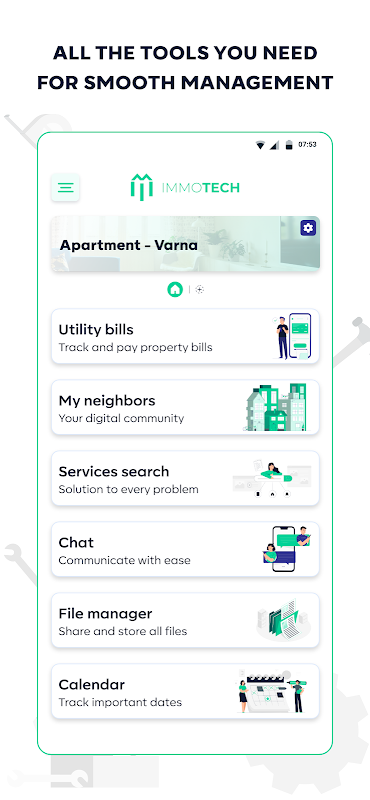 Immotech е абсолютно всичко за едно домакинство по дигитален път - плащане на сметки; следене на разходи; комуникация със съседи; търсене на услуги; складиране по папки на снимки, файлове и документи; споделяне на важни дати в общ calendar. Immotech е мобилното супер-приложение с огромен набор от функционалности, така че всеки живущ да има tech мобилното супер-приложение с огромен набор от функционалности