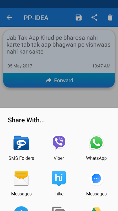★ We offer sharing feature using which you can share any of your SMS message over Email, Whatsapp, Viber, Google+, Facebook, Twitter or any other social or communication medium directly which allows you to share.