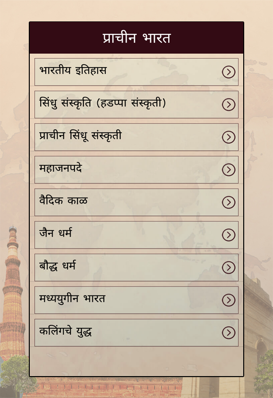 India History in Marathi(भारताचा इतिहास ) application provides various aspects of India history in Marathi Language.
