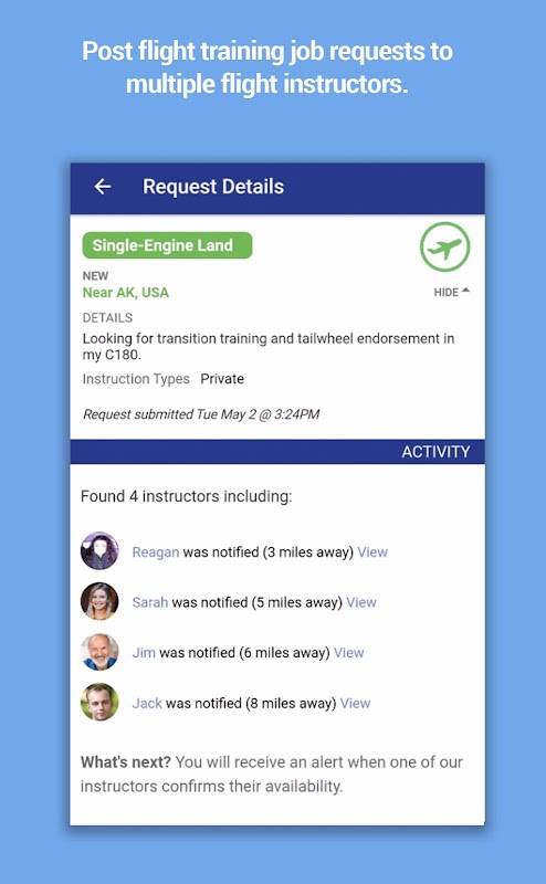 پائلٹ مقامی فلائٹ انسٹرکٹرز کو تلاش اور موازنہ کر سکتے ہیں یا ان کی تربیت کی ضروریات پوسٹ کر سکتے ہیں، یہ سب کچھ مفت میں۔ تمام فلائٹ انسٹرکٹرز نیشنل ایسوسی ایشن آف فلائٹ انسٹرکٹرز کے ممبر ہیں، جو ہر پائلٹ کے منفرد سیکھنے کے انداز کے لیے اعلیٰ سطح کی پیشہ ورانہ مہارت اور عزم کی یقین دہانی کراتے ہیں۔ فکسڈ ونگ، روٹر ونگ، گلائیڈر، ڈرون اور ہوا سے ہلکے زمروں میں اپنے انسٹرکٹر کو تلاش کریں۔ چاہے ابتدائی تربیت، اضافی درجہ بندی، پرواز کا جائزہ، یا کچھ اور مخصوص۔ تفصیلی فلائٹ انسٹرکٹر پروفائلز اور جائزوں کا جائزہ لیں۔ آسانی سے بات چیت کریں اور اپنا اگلا سبق بک کریں۔ ایک بار جب آپ کی تربیت مکمل ہو جائے تو، محفوظ ادائیگیاں بھیجیں اور اپنے تجربے کے حوالے سے اپنے انسٹرکٹر کا جائزہ لیں۔