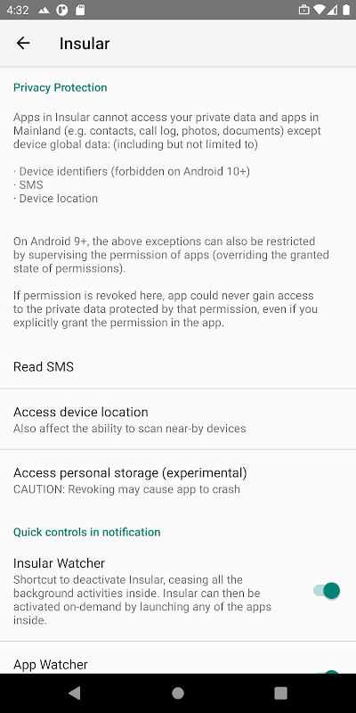 - DEVICE-ADMIN: Device administrator privilege is required to create the Insular space (work profile), which serves as the fundamental functionality of Insular. It will be explicitly requested for your consent.