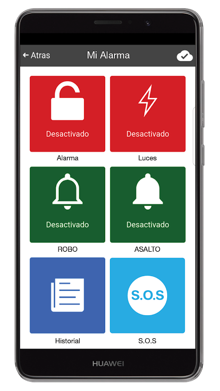 Mediante prácticos íconos, podrá activar/desactivar su alarma o cualquier otro dispositivo electrónico como luces, riego o el aire acondicionado. También puede consultar historial de eventos. Al mismo tiempo disponemos de un botón S.O.S. el cuál al presionarlo enviaremos una alerta via SMS junto a las coordenadas de Google Maps, para saber dónde esta ocurriendo la emergencia.
