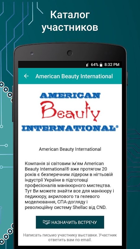 Вы увидите всех участников выставки в алфавитном порядке с номерами стендов. Выбрав любую компанию, Вы сможете просмотреть краткую информацию о ней, а также контактные данные - сайт, телефон и адрес.